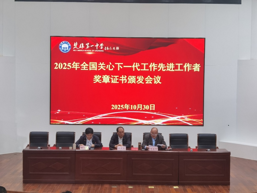 2025年10月30日下午,楚雄州关心下一代工作委员会常务副主任江正荣、副主任李振华等领导一行莅临楚雄一中,为获得2025年全国关心下一代工作先进工作者和从事关心下一代工作满10年的同志颁发荣誉证书和荣誉章。学校党委书记杨宝生主持颁发仪式。