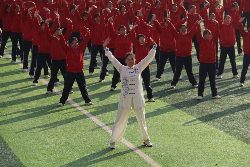 高二(1)部献上健身操《青青世界》,同学们舞姿整齐如虹,以铿锵节拍奏响“千人同心、聚力前行”的奋进乐章,尽显新时代少年向阳而上的昂扬斗志。