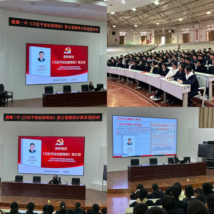 为推动党的创新理论进校园、入人心,引导广大师生在中国式现代化征程中明确使命担当,近日,楚雄一中隆重举行《习近平谈治国理政》第五卷精神示范宣讲活动。活动特邀楚雄青年宣讲团成员李美芬老师主讲,全校师生代表齐聚现场,共同汲取思想力量、凝聚奋进共识。