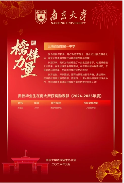 热烈祝贺我校优秀毕业生苏玺舟同学在南京大学2024 - 2025年度评选中,凭借出色的表现荣获人民奖学金,为母校增添了光彩。