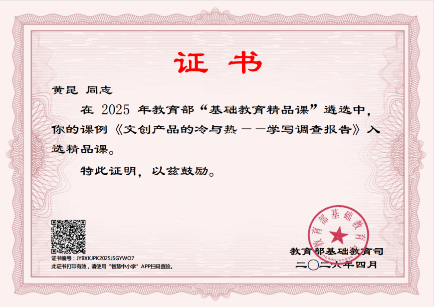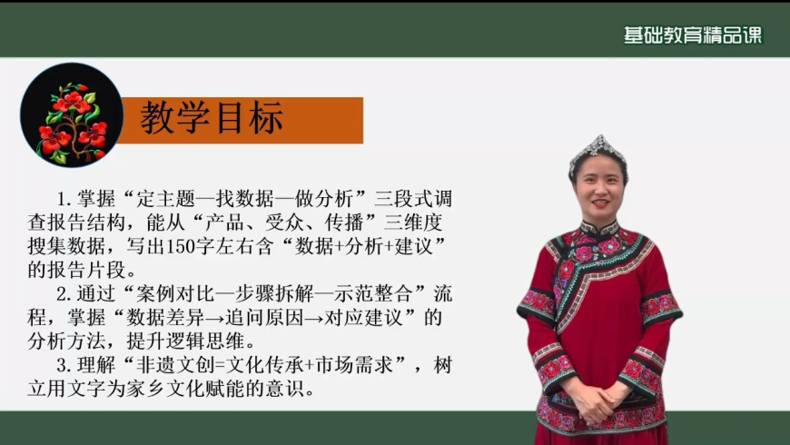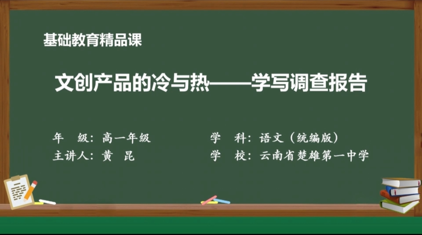 本次入选的精品课《文创产品的冷与热—— 学写调查报告》,依托人教版高中语文必修上册 “家乡文化生活” 单元设计,立足新课标对实用写作与文化传承的要求,把调查报告写作训练与楚雄本地非遗彝绣文创的真实情境紧密结合。